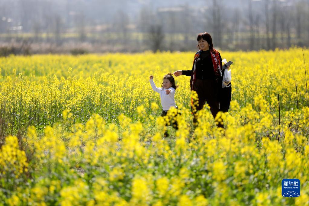 3月8日,游客在湖南省资兴市蓼江镇油菜花海赏景游玩。