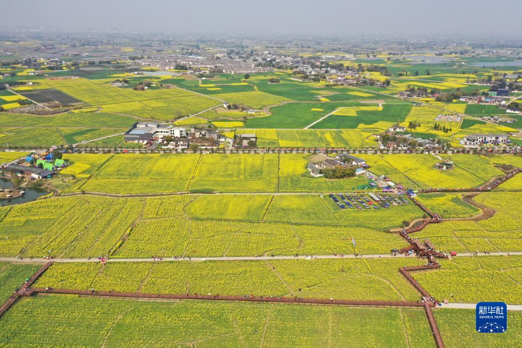 3月8日在四川省广汉市高坪镇李堰村拍摄的油菜花田(无人机照片)。
