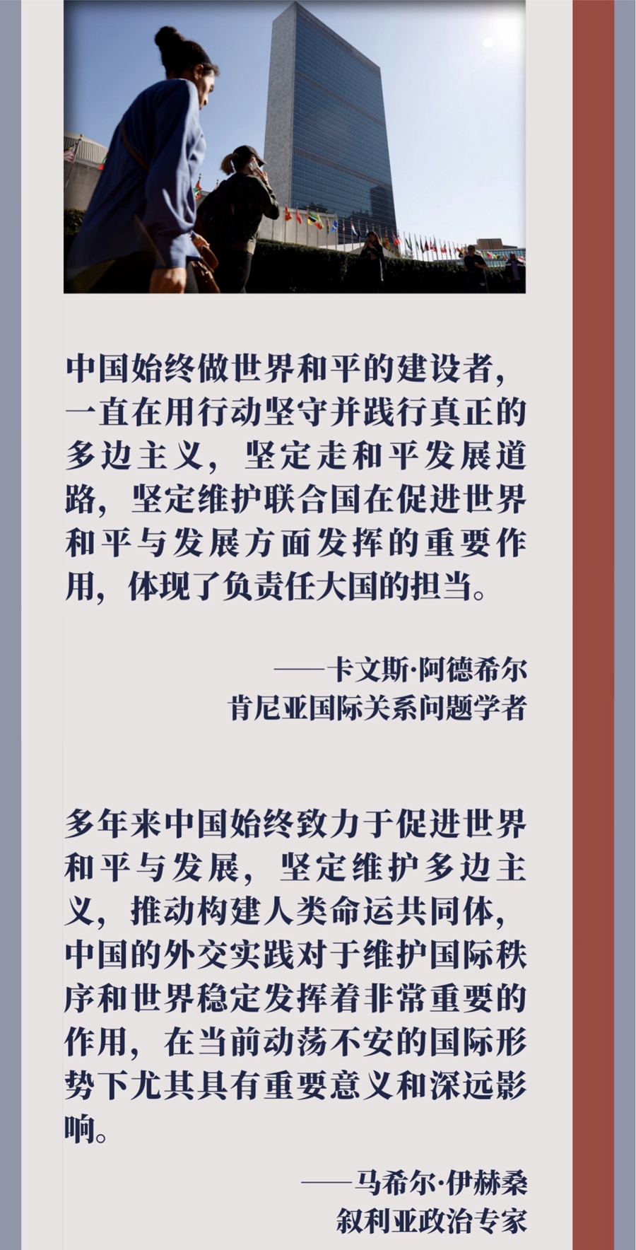 肯尼亚国际关系问题学者卡文斯·阿德希尔表示,中国始终做世界和平的建设者,一直在用行动坚守并践行真正的多边主义,坚定走和平发展道路,坚定维护联合国在促进世界和平与发展方面发挥的重要作用,体现了负责任大国的担当。