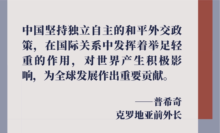 克罗地亚前外长普希奇说,中国坚持独立自主的和平外交政策,在国际关系中发挥着举足轻重的作用,对世界产生积极影响,为全球发展作出重要贡献。