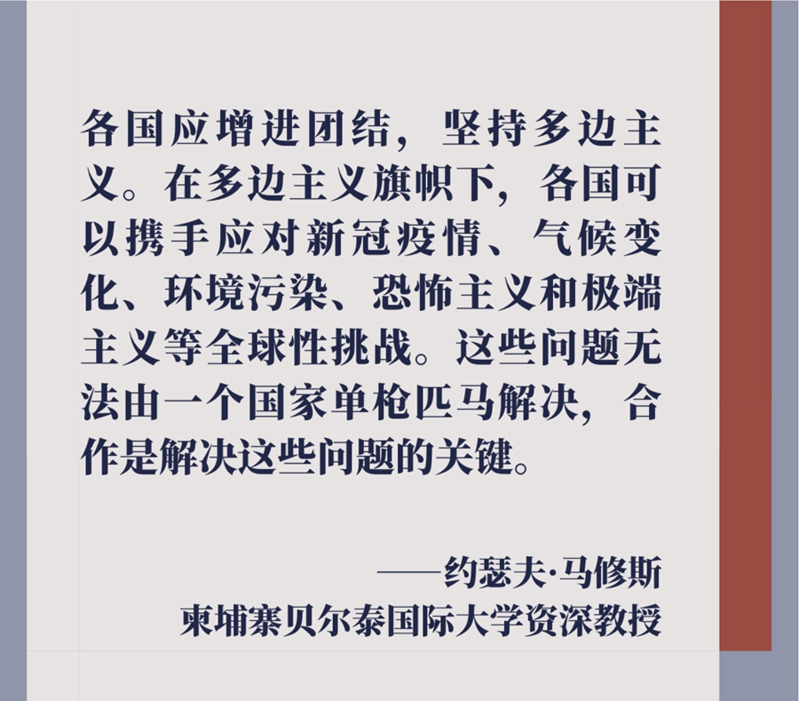 柬埔寨贝尔泰国际大学资深教授约瑟夫·马修斯说,各国应增进团结,坚持多边主义。在多边主义旗帜下,各国可以携手应对新冠疫情、气候变化、环境污染、恐怖主义和极端主义等全球性挑战。这些问题无法由一个国家单枪匹马解决,合作是解决这些问题的关键。