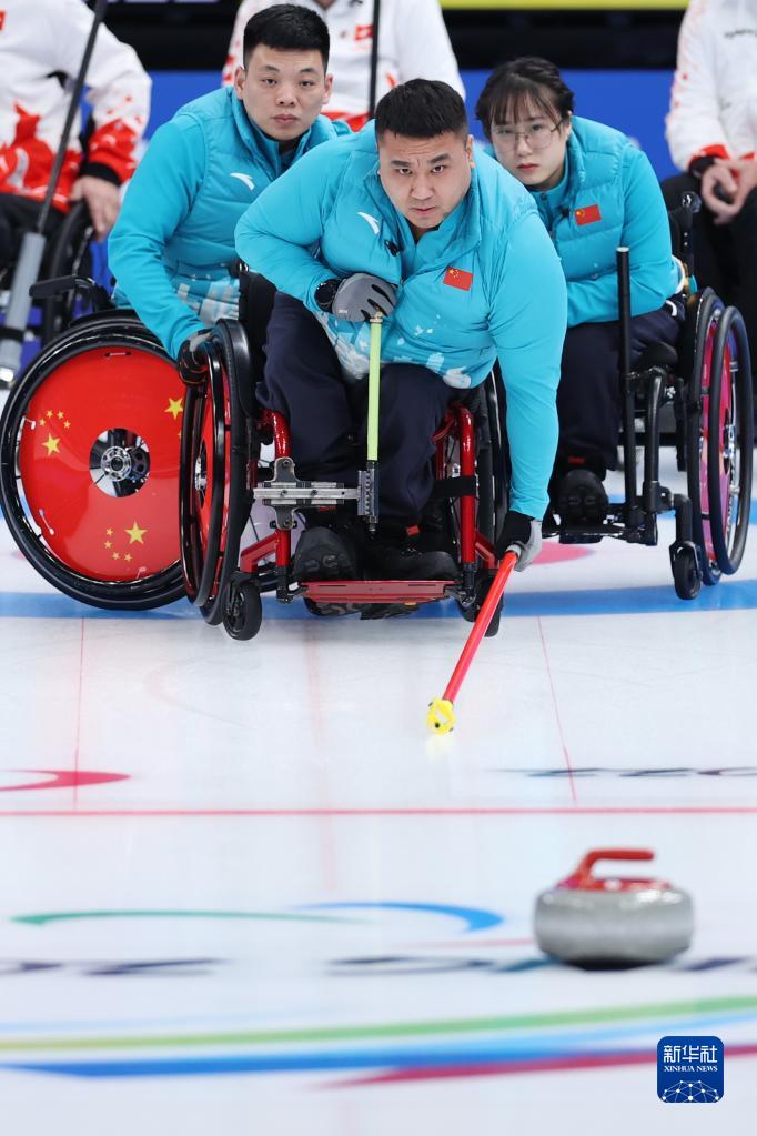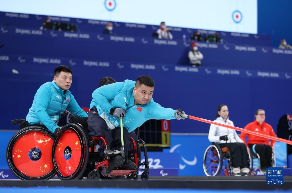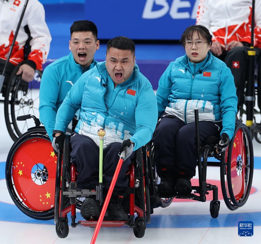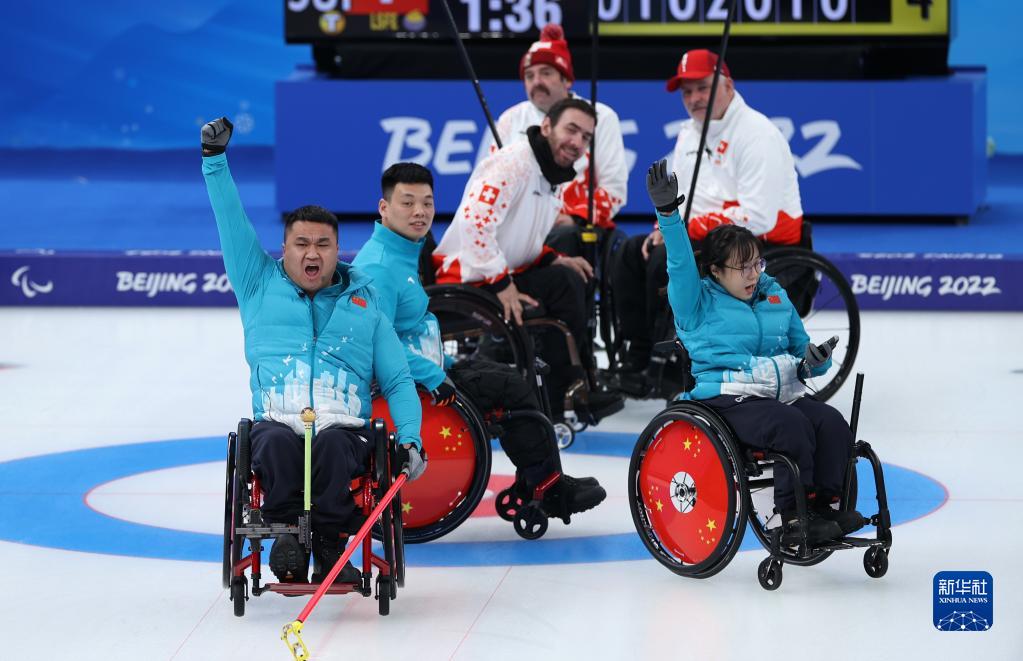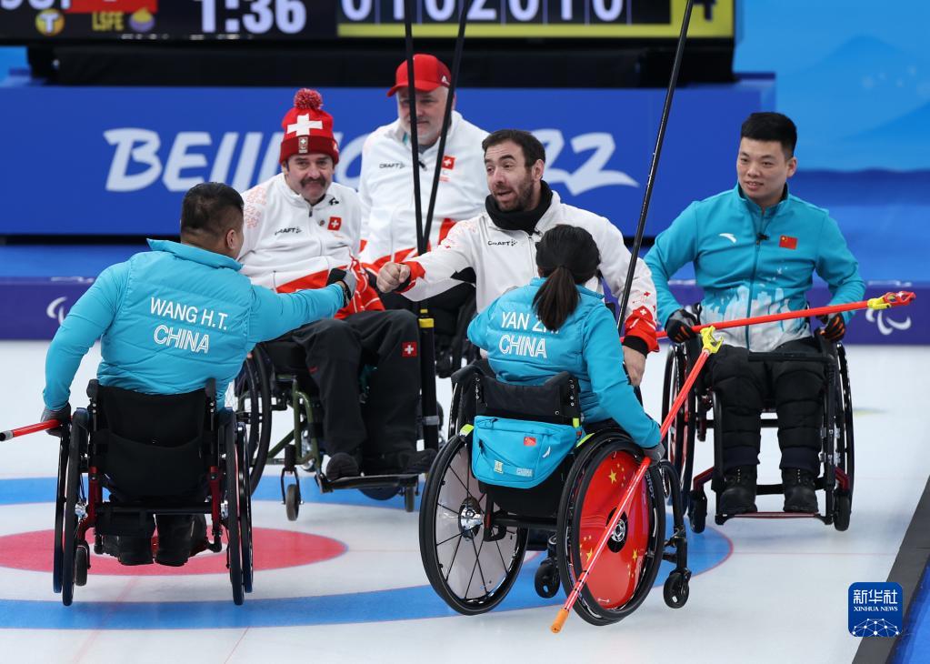 当日,在北京国家游泳中心“冰立方”举行的北京2022年冬残奥会轮椅冰壶循环赛中,中国队以7比4战胜瑞士队。