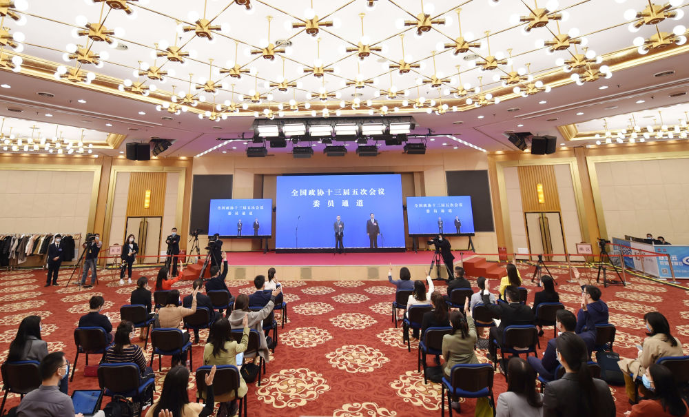 3月4日,全国政协十三届五次会议第一场“委员通道”采访活动在北京人民大会堂新闻发布厅举行。这是分会场。新华社记者 陈钟昊 摄
