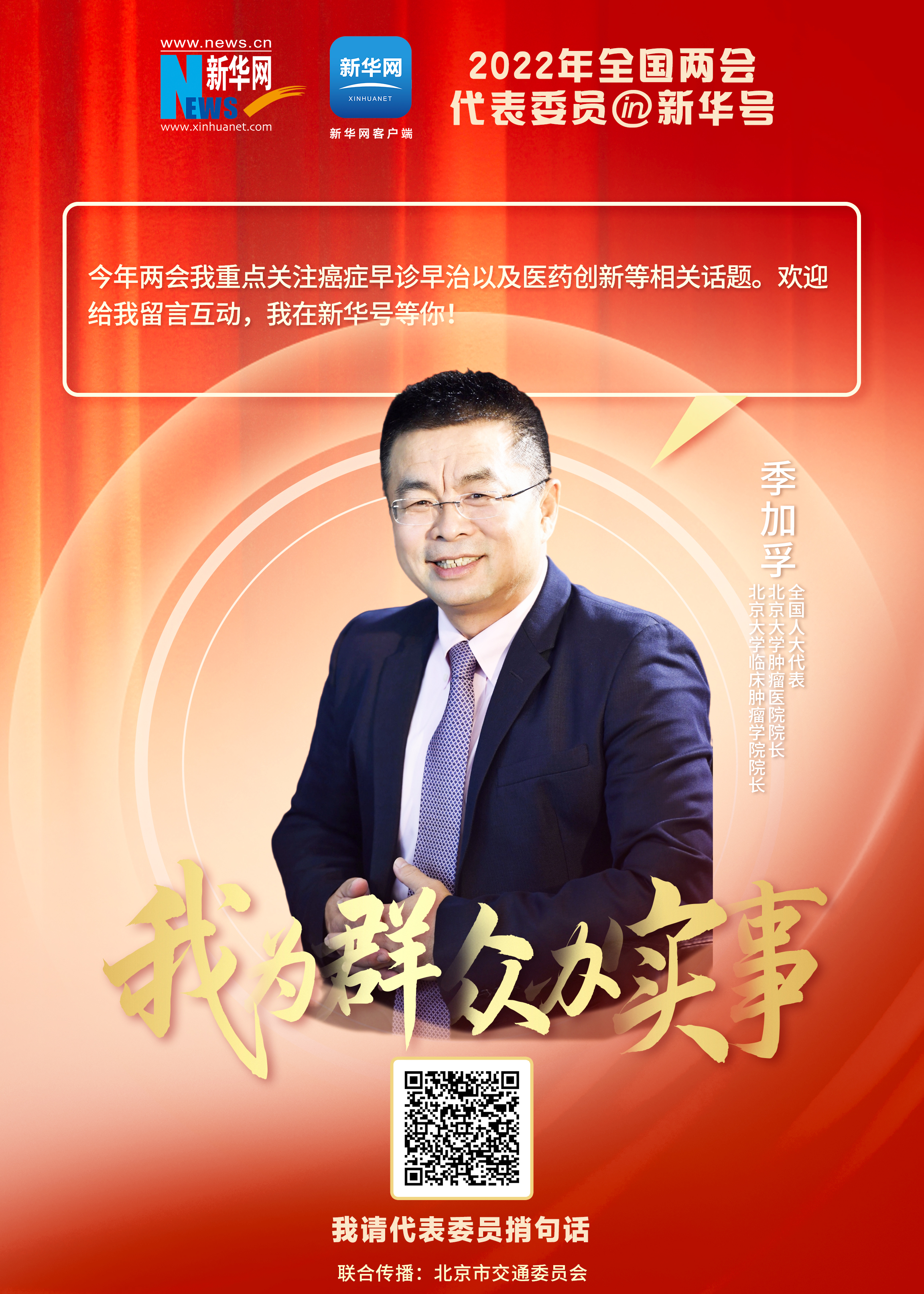 新华网《我为群众办实事丨2022年全国两会,我请代表委员捎句话》新媒体互动报道中,全国政协委员、北京大学肿瘤医院院长季加孚与网友分享他今年两会关注方向并与网友在线互动。