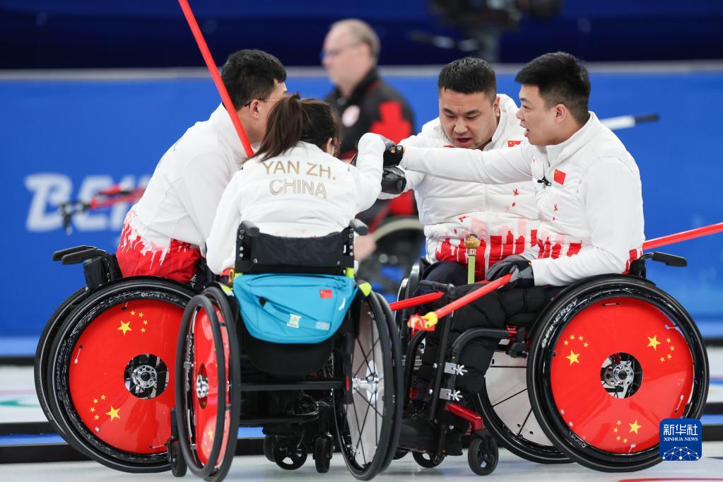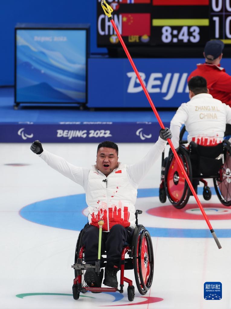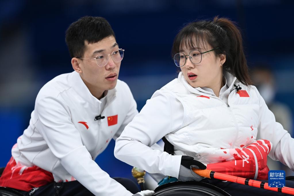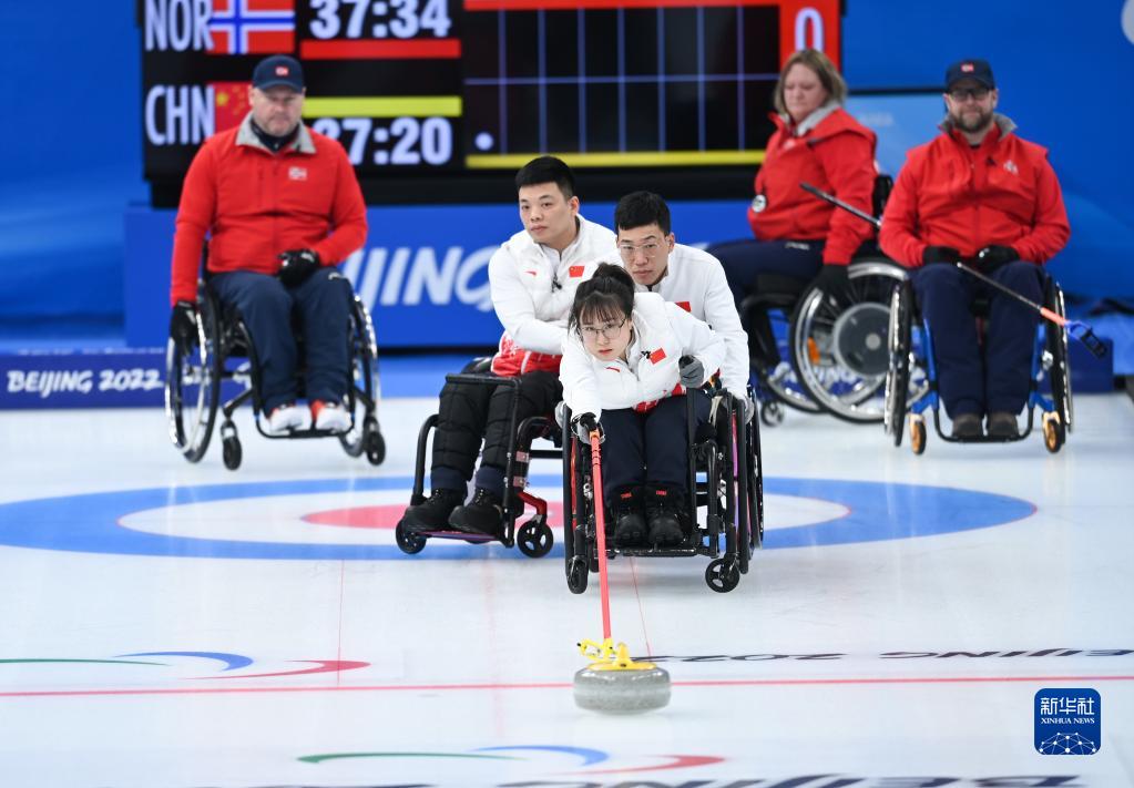 当日,在北京国家游泳中心“冰立方”举行的北京2022年冬残奥会轮椅冰壶循环赛中,中国队以7比4战胜挪威队。