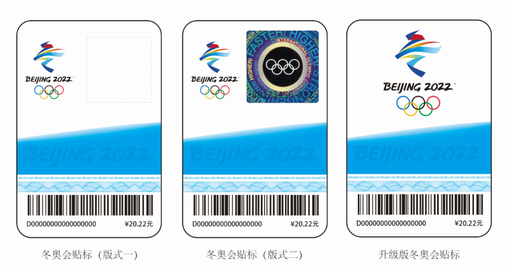 冬奥会特许商品防伪标签(贴标)的3种版式。北京邮票厂提供