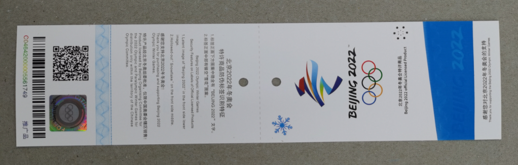 “简单辨识就是,在紫光灯照射下,标签纸张可见荧光点或荧光纤维;另外触摸标签蓝色印刷区域,‘BEIJING2022’图案有明显凹凸手感。假冒产品的防伪标是不具备上述特征的,大家可以据此来辨别真伪。”郭恩娟说。