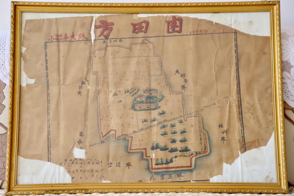小邵寺村有一张绘制于1975年的方田图,这个“村宝”虽有些破旧,却被精心装裱,田、井、路、树、水利设施清晰可见。50多年来,方田图不仅见证了村庄发展,也承载着张秋江一家四代人孜孜以求的种粮梦。