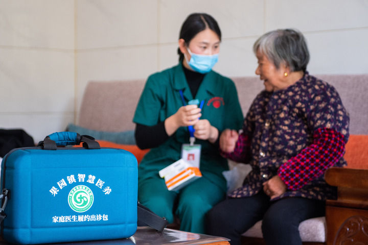 在湖南省长沙市长沙县果园镇杨泗庙社区,医务人员指导居家老人用药(2021年11月12日摄)。 新华社记者 陈思汗 摄