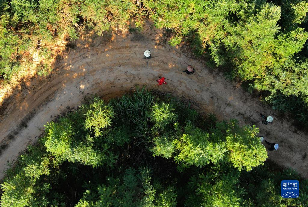 3月11日,黄秋水和同事走在林区小路上(无人机照片)。新华社记者 魏培全 摄