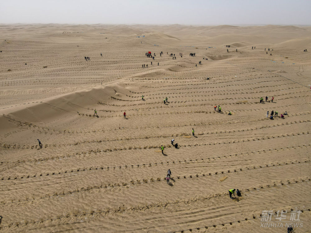 在甘肃省古浪县北部沙区旱麻岗治沙点,八步沙林场治沙人和群众一起扎草方格压沙(无人机照片,2020年3月6日摄)。