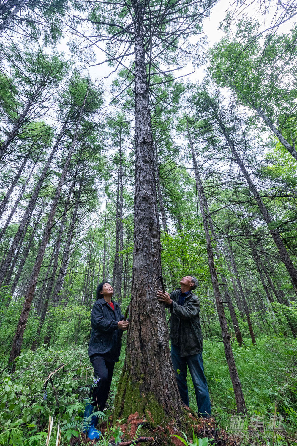 2021年6月3日,在黑龙江省伊春市乌马河林业局有限公司乌马河林场分公司施业区,张英善、燕玉平夫妇查看他们30多年前种下的树。几十年来,夫妻二人亲手栽下100多万株树。