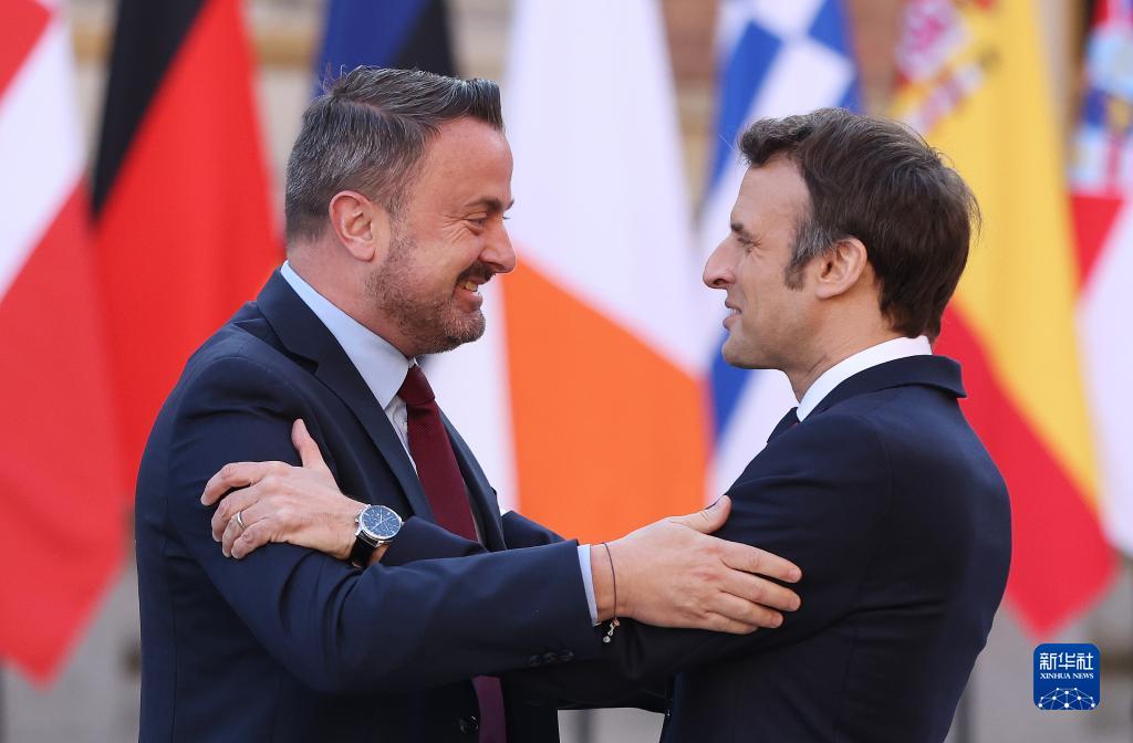 3月10日,在法国巴黎近郊的凡尔赛宫,法国总统马克龙(右)欢迎卢森堡首相贝泰尔。新华社记者 高静 摄