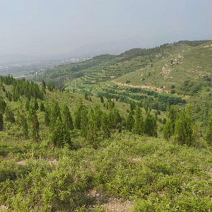 登上吴家山,一片绿色映入眼帘:脚下侧柏苍翠挺拔,黄栌、榛子等点缀其间。极目远眺,连绵的山头郁郁葱葱。