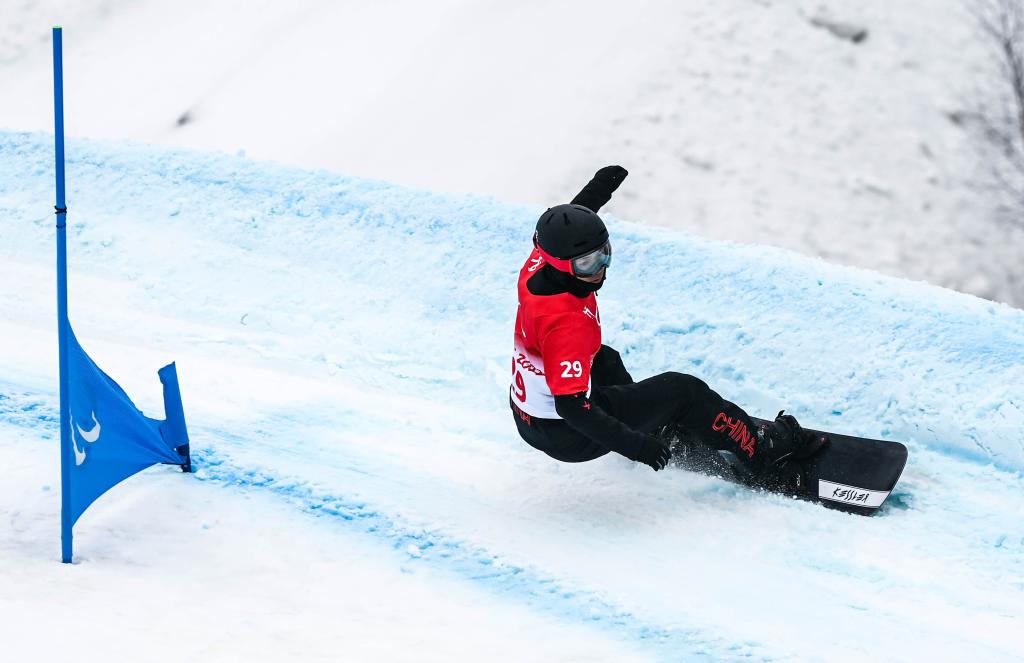 3月11日,中国选手武中伟在比赛中。他最终获得残奥单板滑雪男子坡面回转(LL1级)比赛冠军。新华社记者颜麟蕴摄