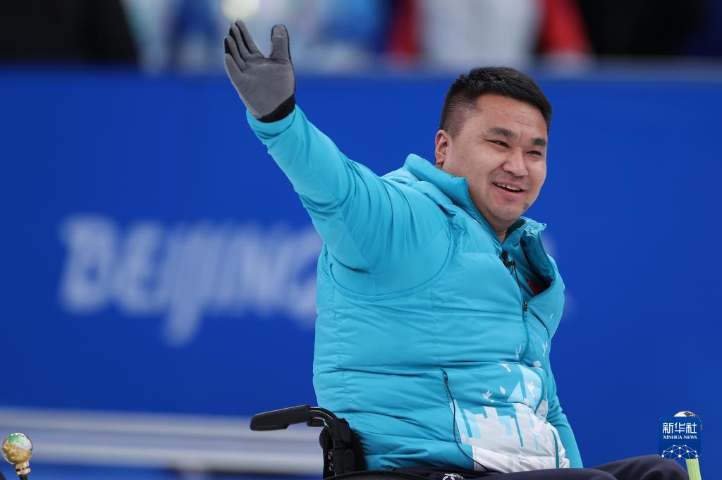 3月12日,中国队选手王海涛在比赛后庆祝。新华社记者 杜潇逸 摄