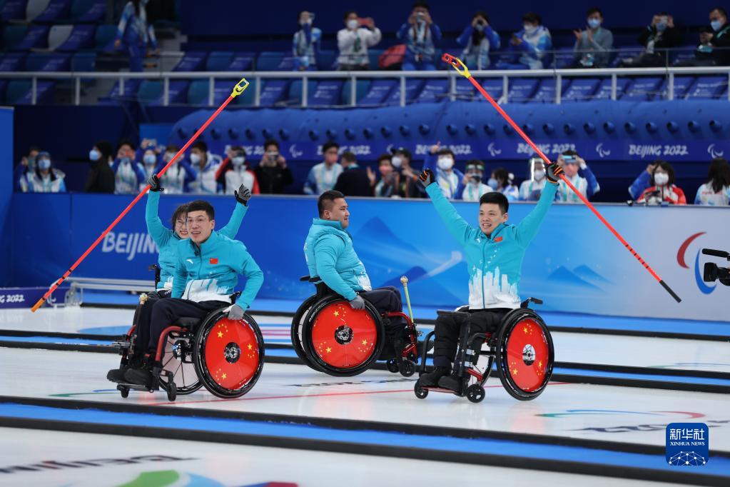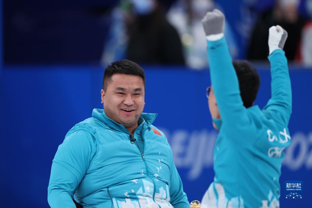 3月12日,中国队选手王海涛(左)与队友陈建新在比赛后庆祝。新华社记者 杜潇逸 摄