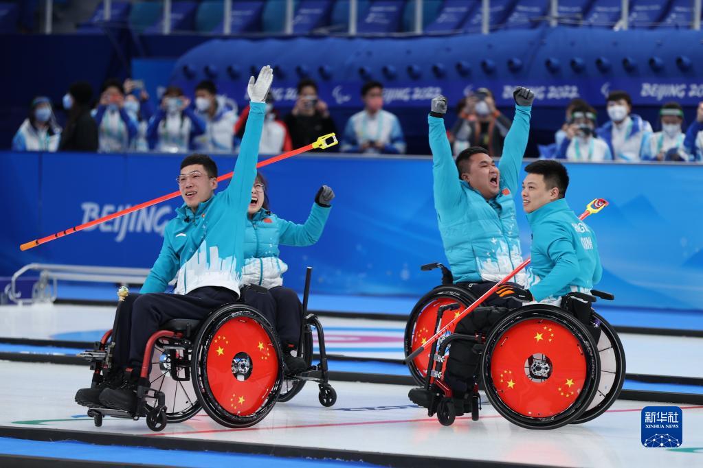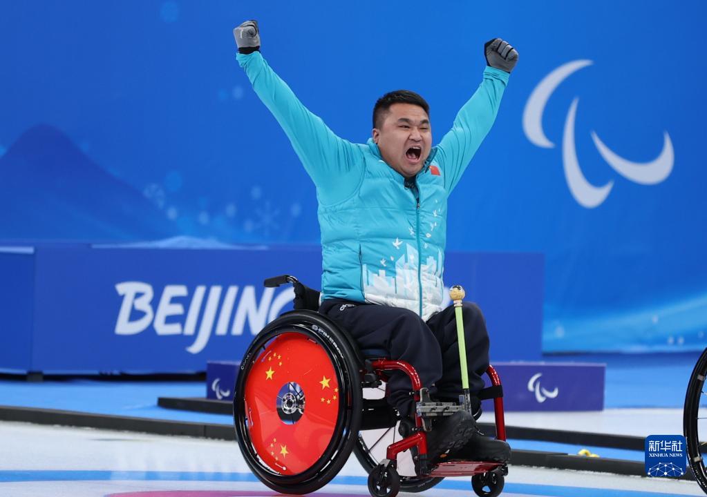 3月12日,中国队选手王海涛在比赛后庆祝。新华社记者 杜潇逸 摄