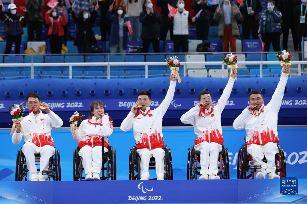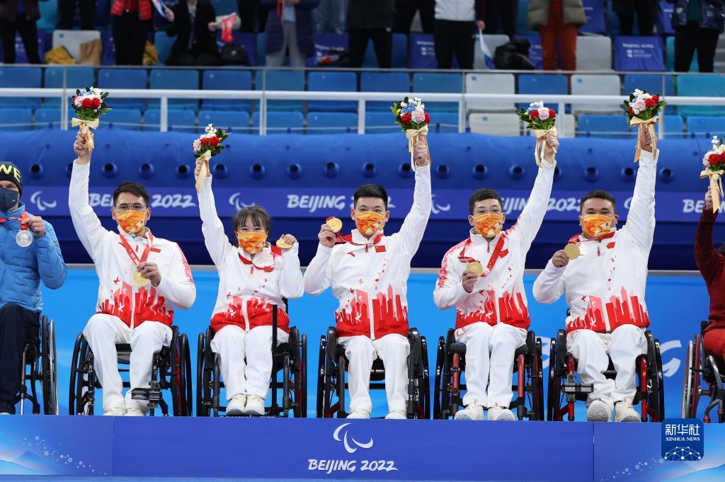 3月12日,中国队选手孙玉龙、闫卓、张明亮、陈建新和王海涛(从左至右)在颁奖仪式上。新华社记者 杜潇逸 摄