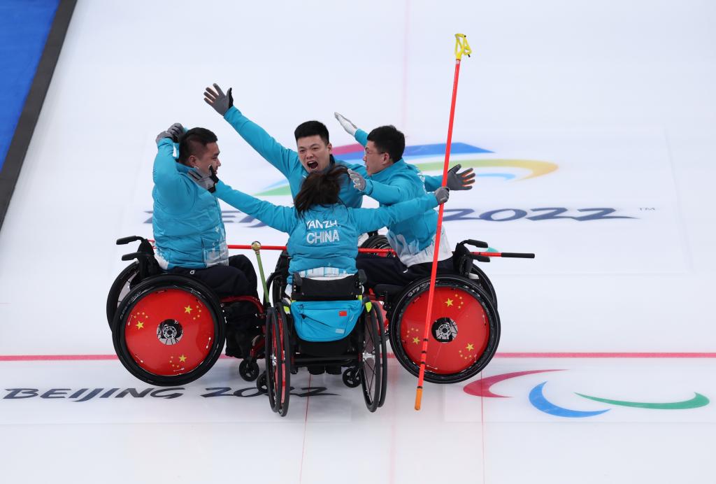 3月12日,中国队选手在北京冬残奥会轮椅冰壶金牌赛后庆祝。新华社发(胡星宇摄)
