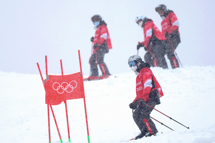 2月13日,工作人员冒雪在国家高山滑雪中心平整竞技赛道。新华社记者陈斌摄