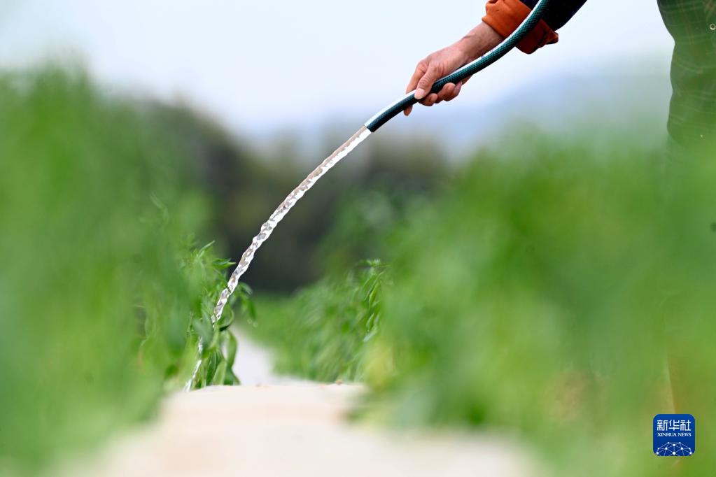 3月13日,在广西柳州市柳东新区雒容镇坭桥村,村民在地里给刚种植的辣椒苗浇水。