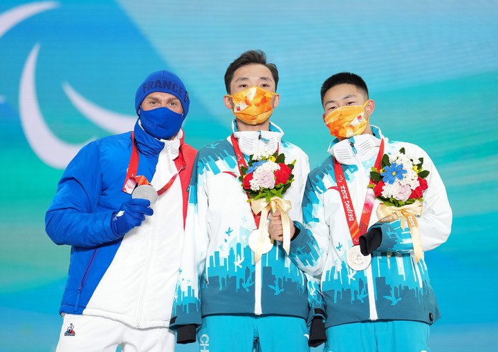 3月12日,冠军中国选手王晨阳(中)、亚军法国选手邦雅曼·达维耶(左)、季军中国选手蔡佳云在北京2022年冬残奥会残奥越野滑雪男子中距离自由技术(站姿)比赛颁奖仪式上合影。新华社记者彭子洋摄