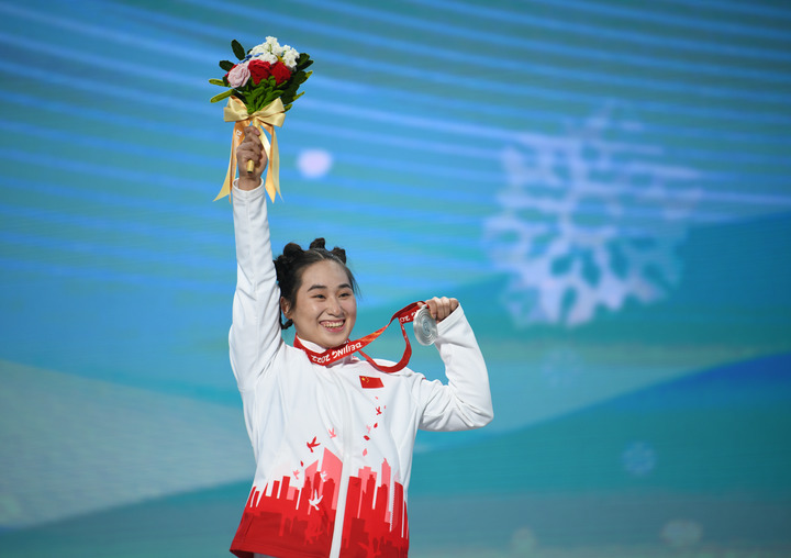 3月12日,获得银牌的中国选手张雯静在高山滑雪女子回转(坐姿)比赛颁奖仪式上。新华社记者孙非摄
