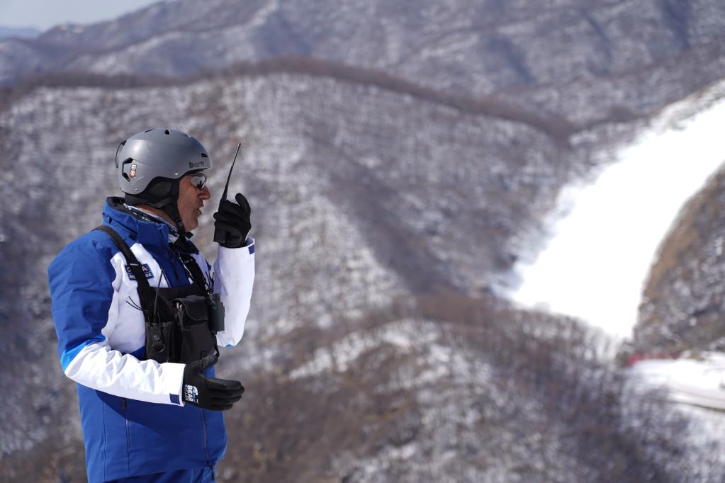 3月2日,在位于北京延庆的国家高山滑雪中心的雪道上,卡佩利·达里奥在用对讲机联系山上的运动员。新华社记者彭子洋摄