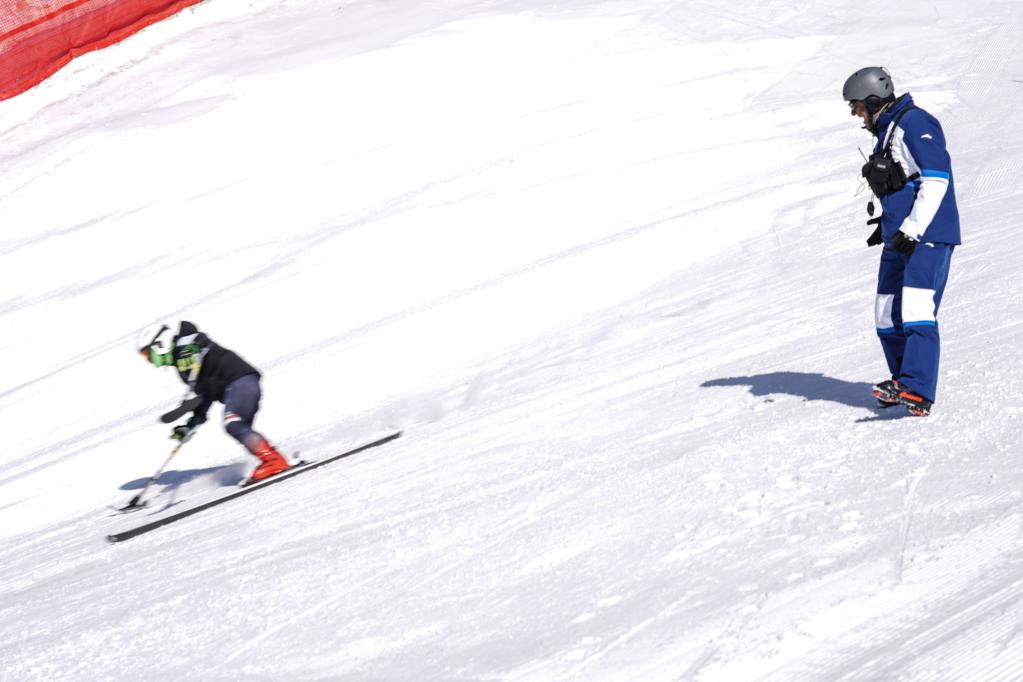 3月2日,在位于北京延庆的国家高山滑雪中心的雪道上,卡佩利·达里奥(右)在观察运动员训练。新华社记者彭子洋摄