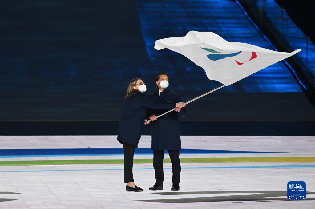3月13日晚,北京2022年冬残奥会闭幕式在北京国家体育场举行。这是米兰市副市长安娜·斯卡武佐(左)和科尔蒂纳丹佩佐市市长盖迪纳在会旗交接仪式上挥舞国际残奥委会会旗。新华社记者 李尕 摄