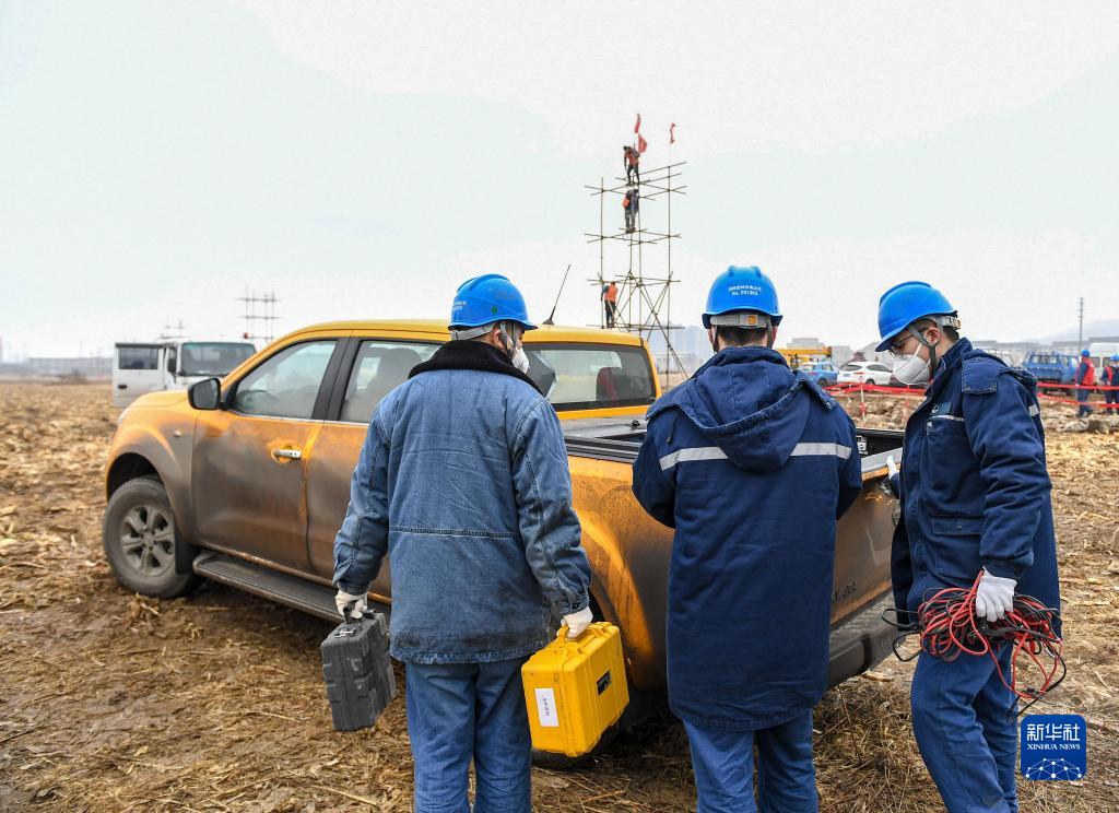 3月13日,国网吉林供电公司工作人员在隔离方舱施工现场工作。