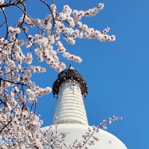 3月14日,盛开的山桃花掩映着北京北海公园白塔。