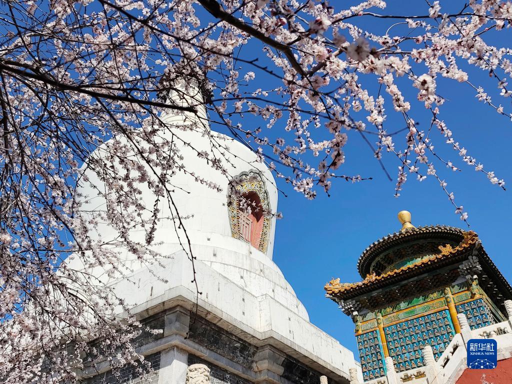 3月14日,盛开的山桃花掩映着北京北海公园白塔。