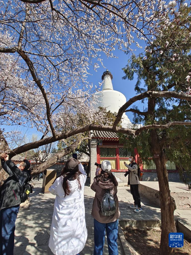 春暖大地,北京北海公园白塔旁的山桃花盛开,吸引不少游客前来欣赏。