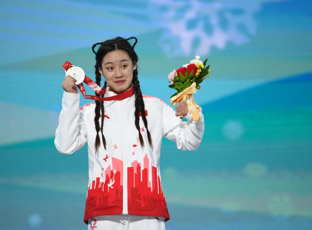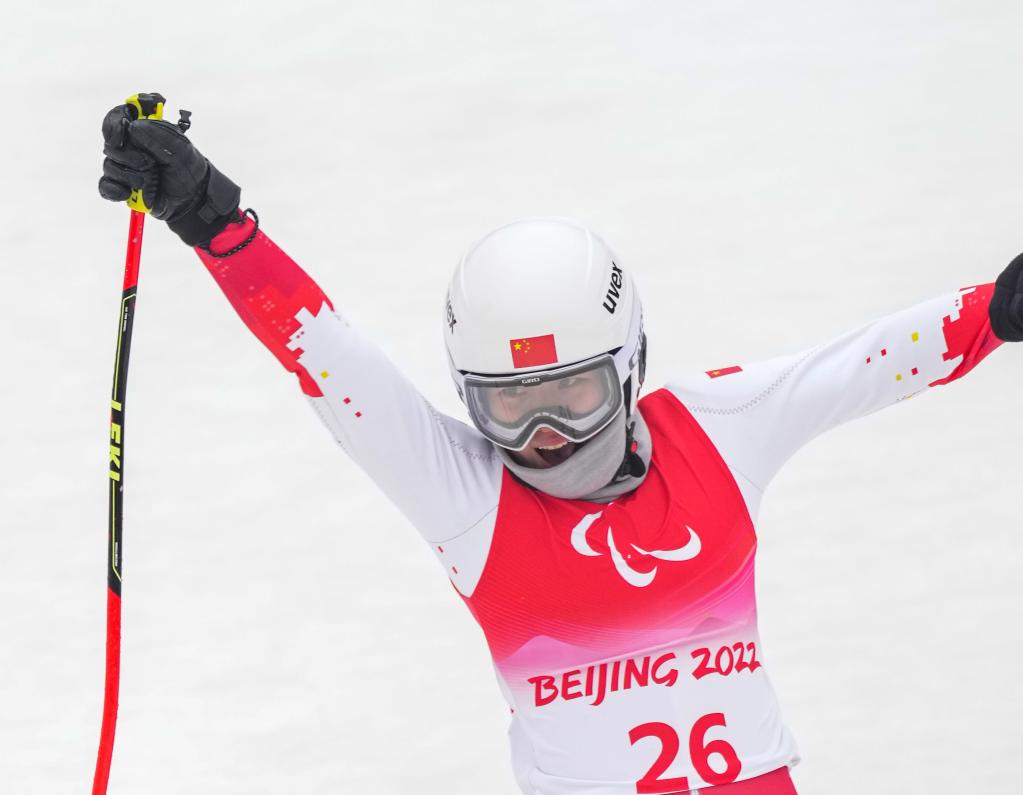 3月12日,残奥高山滑雪女子回转(站姿)比赛中,张梦秋赢得银牌