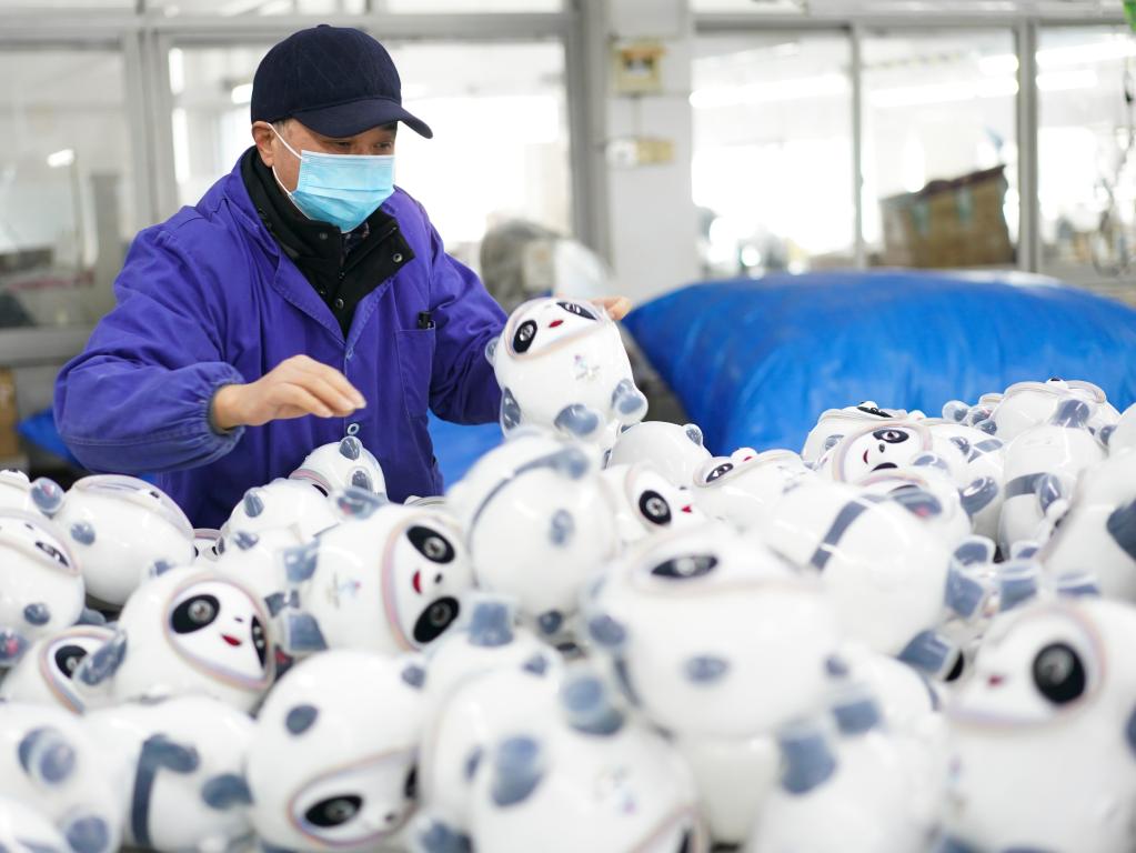 1月19日,在泉州德化县陶瓷旅游观光工厂,工人摆放制作好的“冰墩墩”“雪容融”。新华社记者魏培全摄