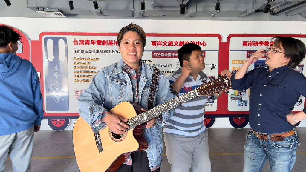 图为赖淑珍(左二)在和其他台湾青年在排练歌曲。新华社记者 付敏 摄