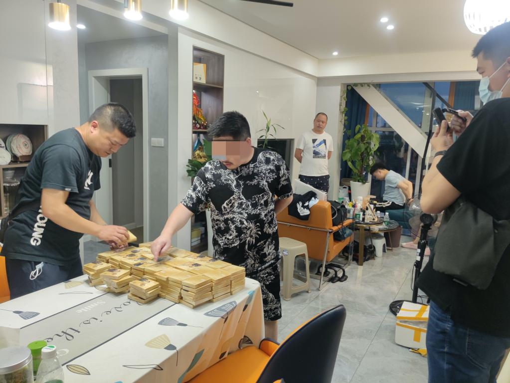 警方在犯罪嫌疑人黄某(左二)住处发现了大量含违禁成分的“锦阁牡蛎肽”。(图片由绵阳市公安局提供)
