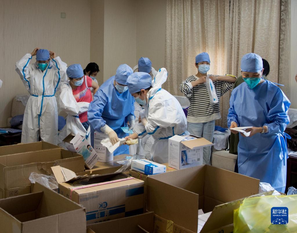 3月14日,香花桥街道社区卫生服务中心的医务人员在某高校开始穿着防护衣物,准备进行检测。