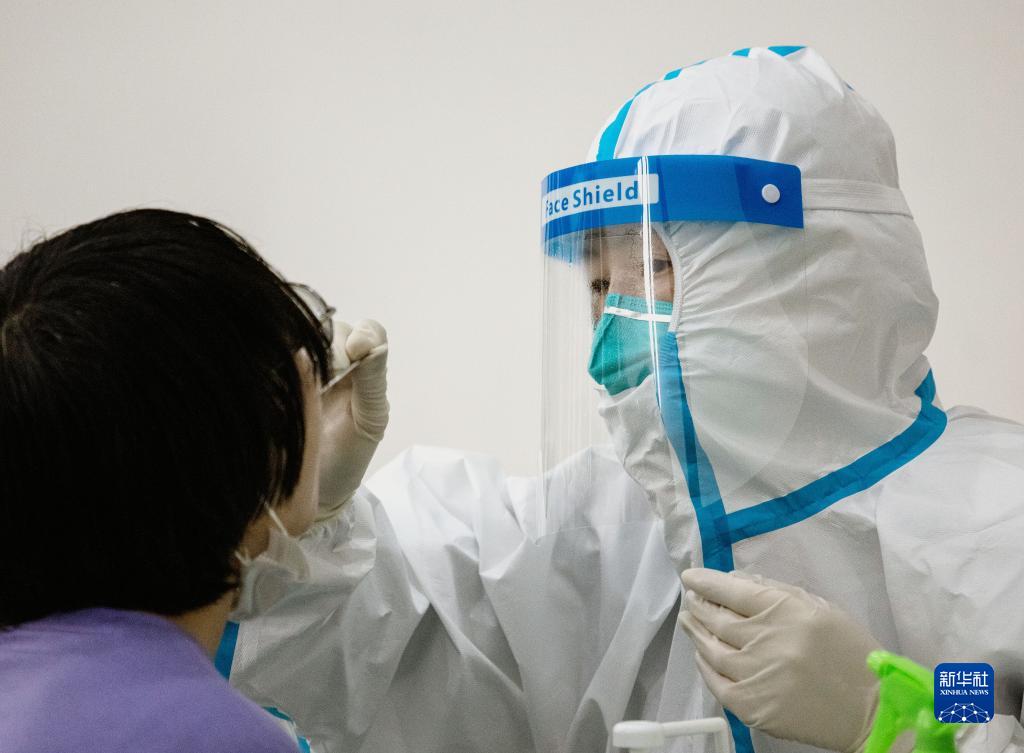 3月14日,香花桥街道社区卫生服务中心的医务人员在为某高校的学生进行核酸采样。