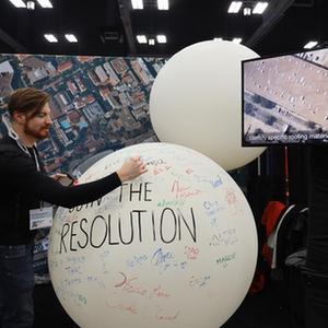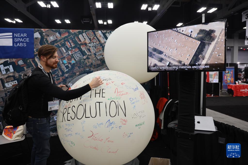 3月13日,在美国奥斯汀举行的“西南偏南”多元创新大会和艺术节上,一名男子在可连续飞行7小时进行地面监测的热气球上签名。新华社记者 徐剑梅 摄