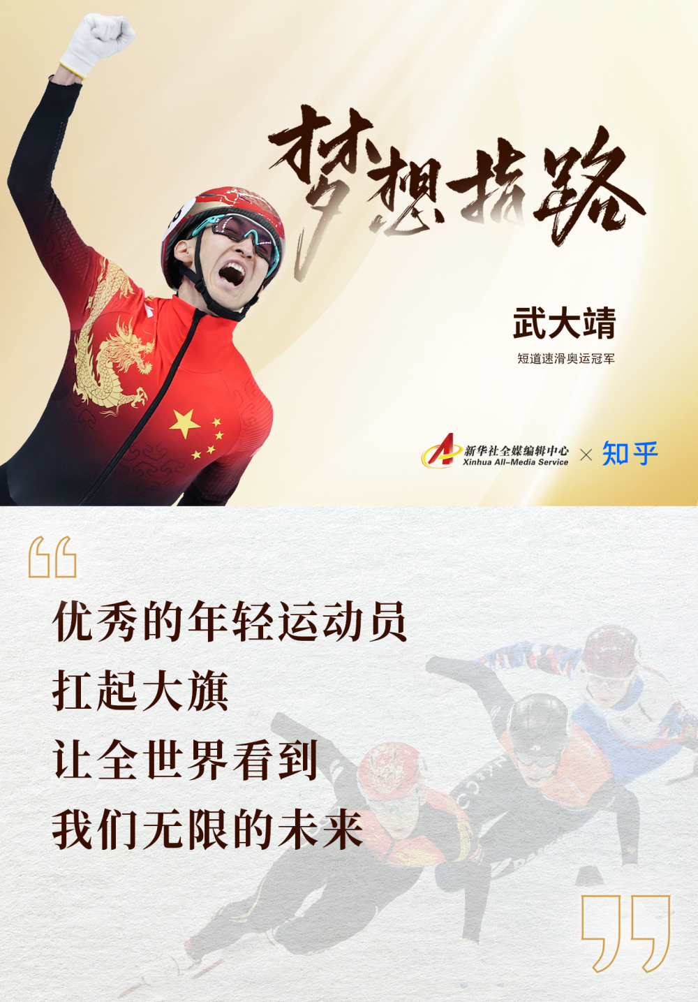 “上个月的北京冬奥会上,在短道速滑男子1000米项目中,我的两位队友任子威、李文龙站上领奖台,分别获得金牌和银牌,这是最让我激动的荣耀时刻。”
