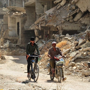 2021年9月23日,在叙利亚首都大马士革城南的巴勒斯坦难民聚居区——耶尔穆克难民营,骑车人在废墟间骑行。新华社发(阿马尔·萨法尔贾拉尼摄)
