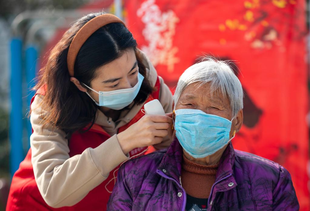 志愿者为老人佩戴免费的助听器。新华社发(汤德宏摄)
