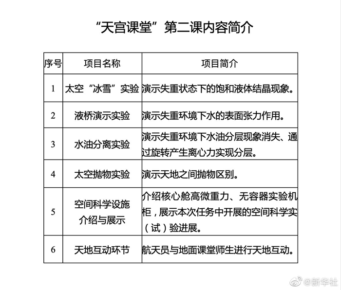 本次太空授课活动继续采取天地对话方式进行,由航天员在轨演示太空“冰雪”实验、液桥演示实验、水油分离实验、太空抛物实验,介绍与展示空间科学设施,旨在传播普及空间科学知识,激发广大青少年不断追寻“科学梦”、实现“航天梦”的热情。