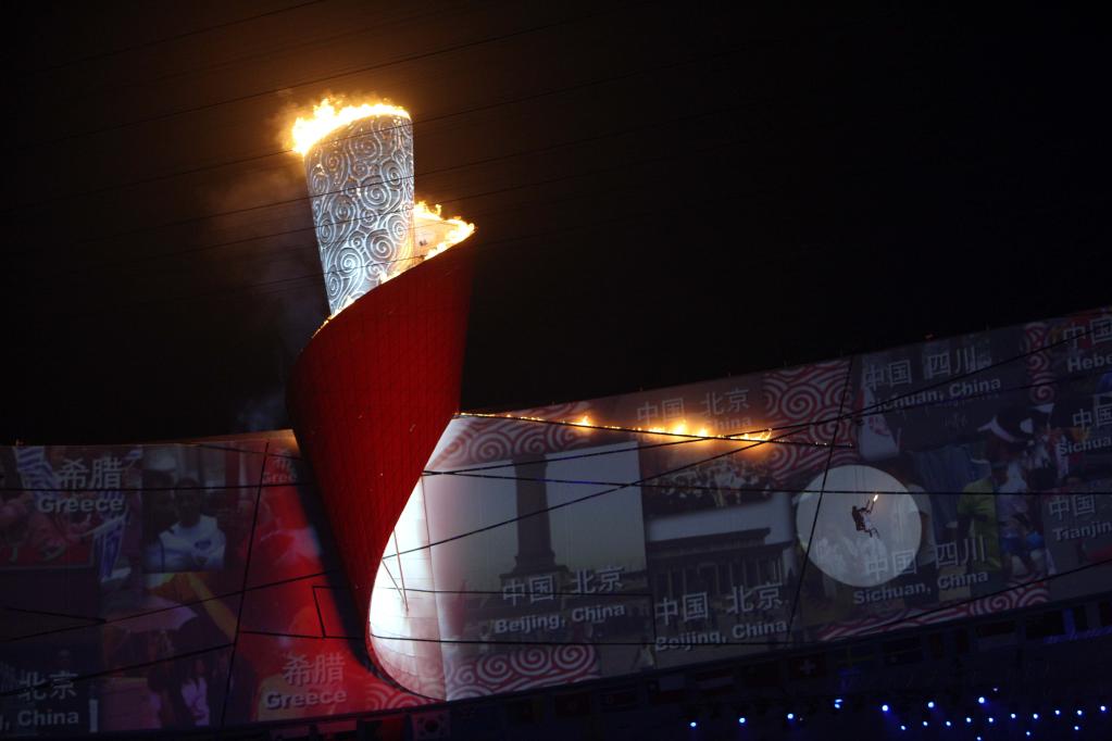 图为2008年8月8日,最后一棒火炬手李宁在北京奥运会开幕式上点燃主火炬。新华社记者 姚大伟 摄