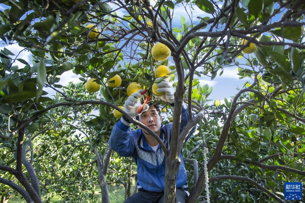 果农在浙江省衢州市常山县太公山胡柚基地采摘胡柚(2021年11月10日摄)。新华社发(陈勤幸摄)