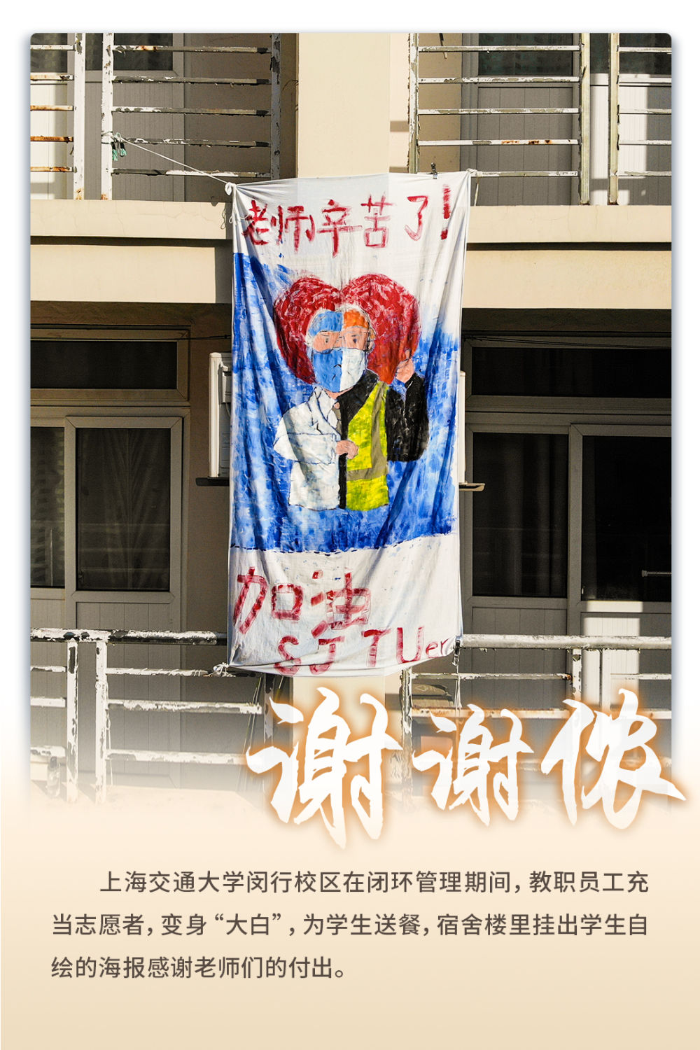 同学们精心制作了海报悬挂在宿舍楼前