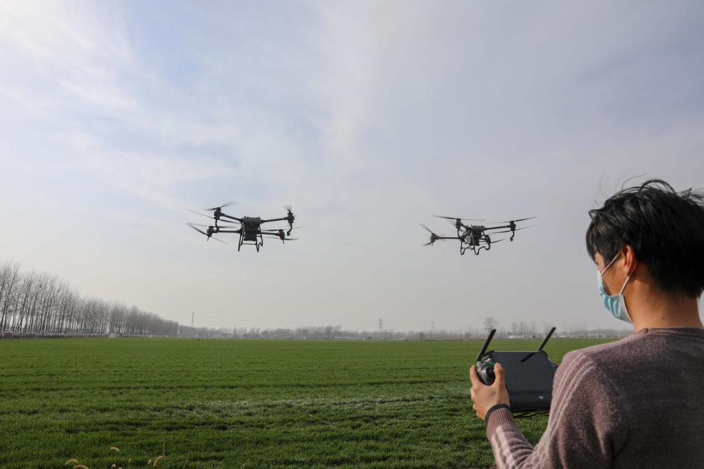 2022年3月3日,无人机在安徽省宿州市埇桥区灰古镇的麦田上空作业。新华社记者 曹力摄